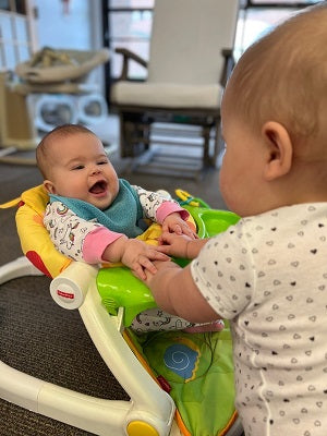 Our Infant Program (2 weeks to 12 months) revolves around consistent love and care for your baby. We give babies lots of attention, helping your child to feel loved, safe and secure. This type of environment is crucial for children to develop and thrive. We have three classrooms for this age group. Each classroom has a ratio of 1 teacher for every 4 babies, and a maximum of 8 babies enrolled each day.